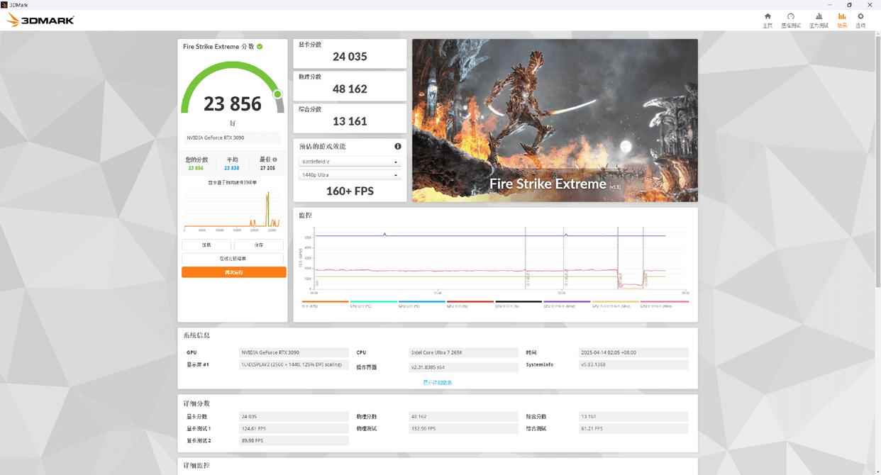 在Fire Strike Extreme测试项目中,这台主机取得了23856分,其中物理分数48162分,显卡分数24035分: