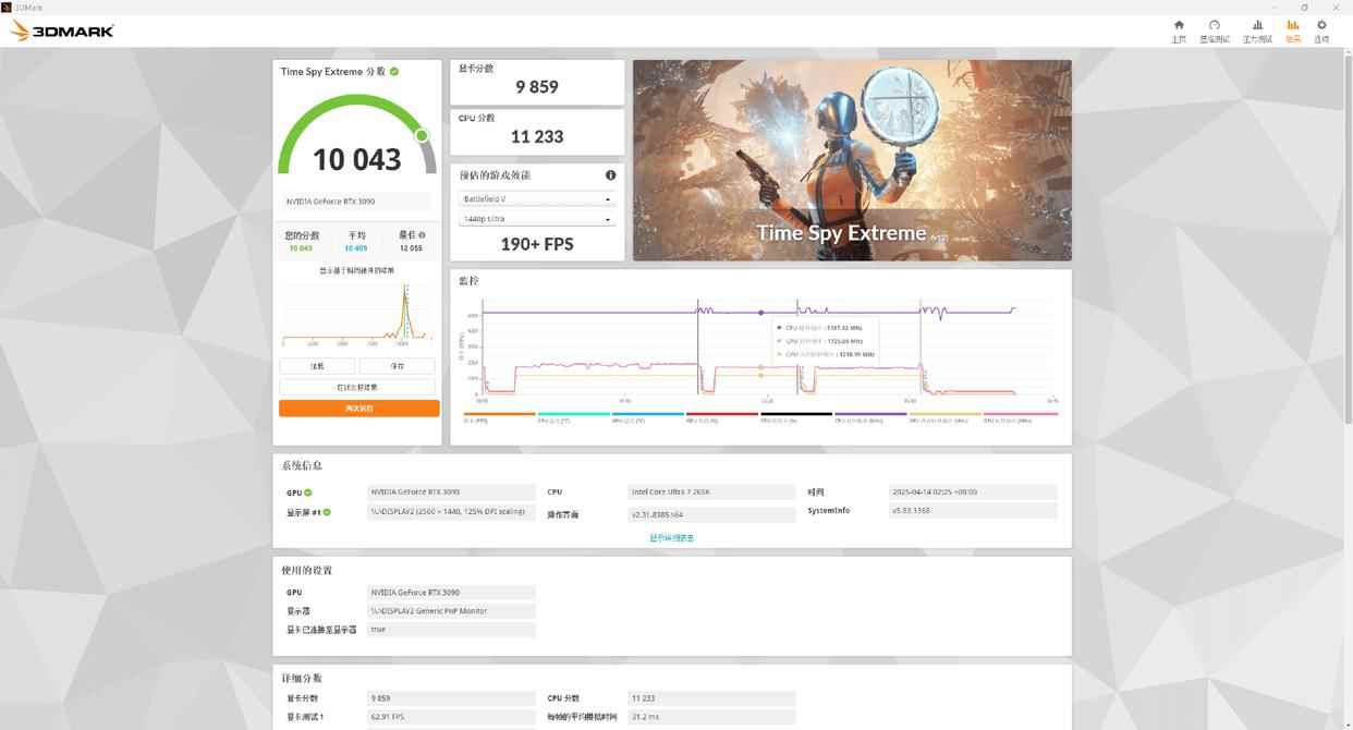在Time Spy Extreme测试项目中,这台主机取得了10043分,其中显卡分数为9859,CPU分数为11233: