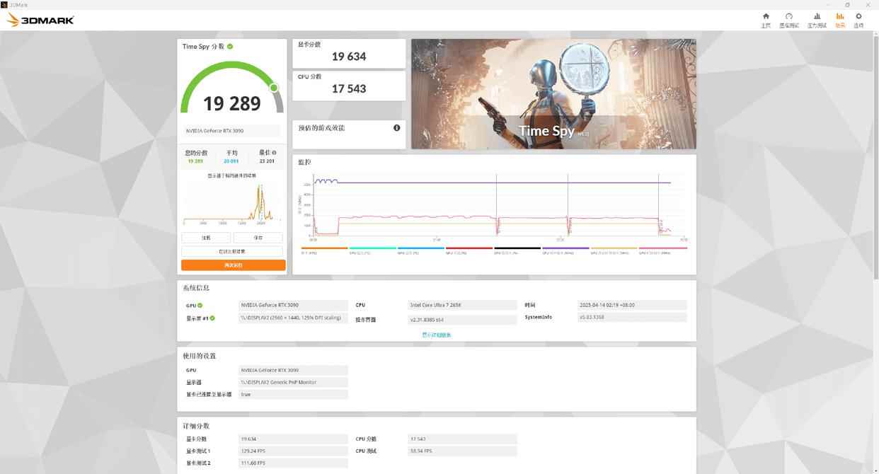 在衡量DX12游戏性能的Time Spy测试项目中,这台主机取得了19289分,其中显卡分数为19634,CPU分数为17543: