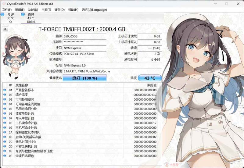 在CrystalDiskInfo中可以看到十铨T-FORCE GC PRO预留了二级OP,可用容量为2000.4 GB,支持NVMe 2.0协议标准。由于二进制与十进制的转换关系,其在Windows中的实际可用容量为1863 GiB。