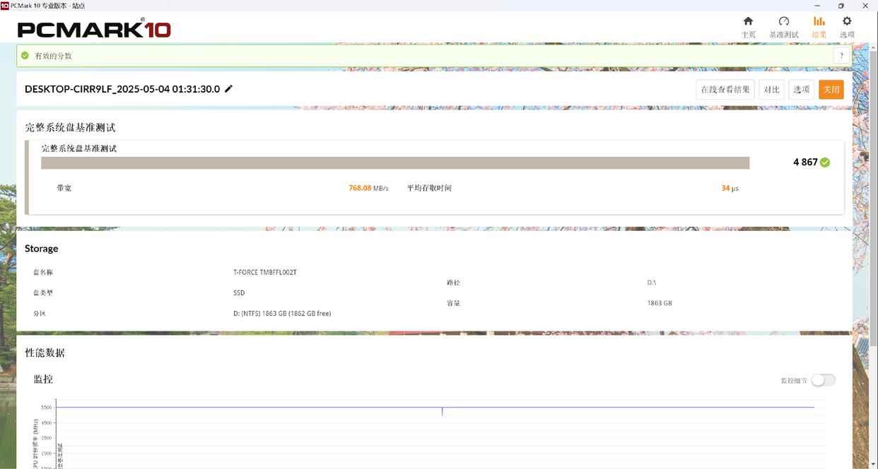 在PCMark 10的完整系统盘基准测试中,十铨T-FORCE GC PRO的得分为4867: