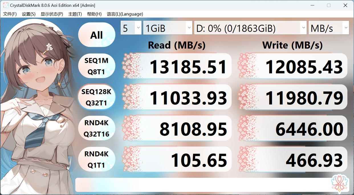 在CrystalDiskMark的测试结果中,十铨T-FORCE GC PRO的表现远超厂商的标称参数,顺序读取速度为13185 MB/s,顺序写入速度为12085 MB/s,QD1 4K随机读取速度也表现不错,达到了105.65 MB/s。