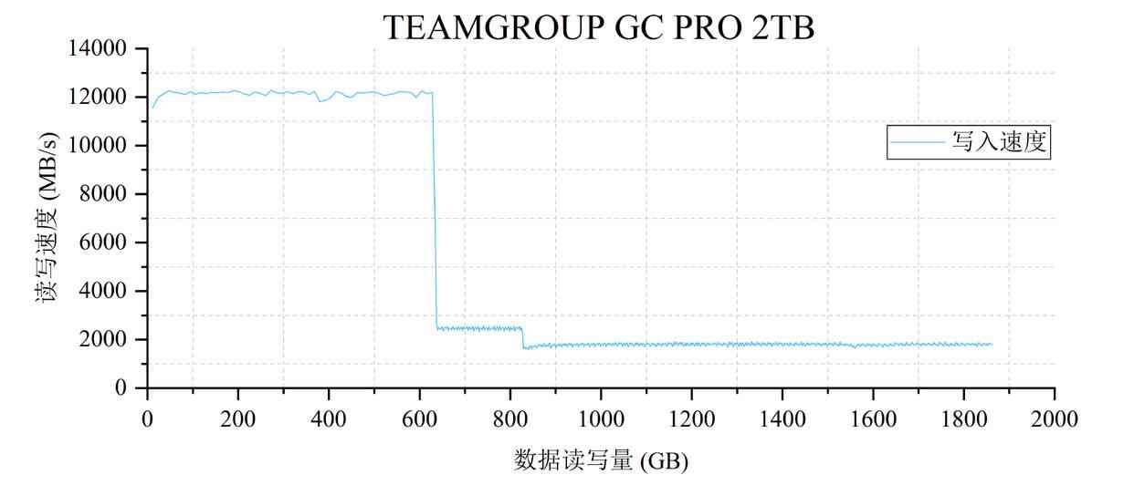 如图所示,十铨T-FORCE GC PRO 2TB的写入曲线呈现典型的三段式结构,其中SLC Cache容量在630 GiB左右,缓内写入速度能维持平均12000 MiB/s以上。