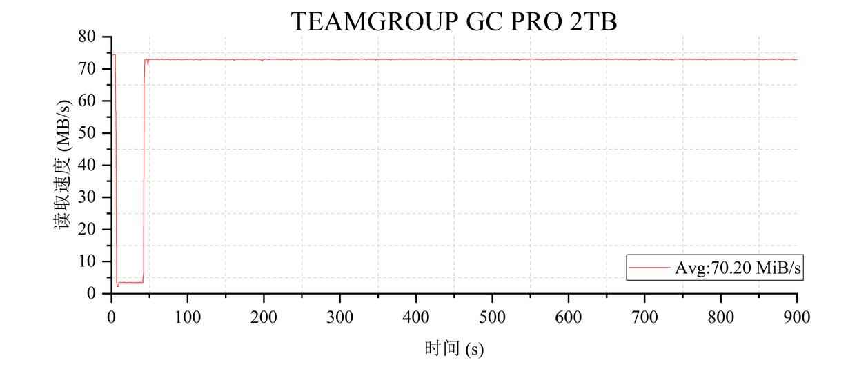 最终记录到的读取性能速度曲线如上图所示,单队列SLC缓外4K随机直读的速度在70.20 MiB/s左右,这个表现已经超过了三星9100 PRO 2TB,接近了致态TiPro9000 2TB,让我大吃一惊: