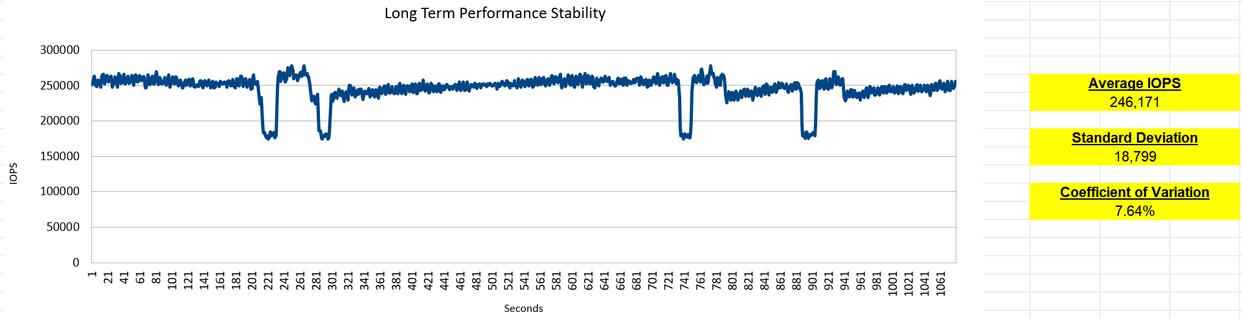 由于CrystalDiskMark测得的实际是基于SLC Cache加速后的结果,不能完全反映SSD真实的性能发挥水平,所以在对十铨T-FORCE GC PRO顺序写入填盘两次后,我顺势进行了15 分钟的Q1T1 4K 随机读取测试,以排除SLC Cache的影响。