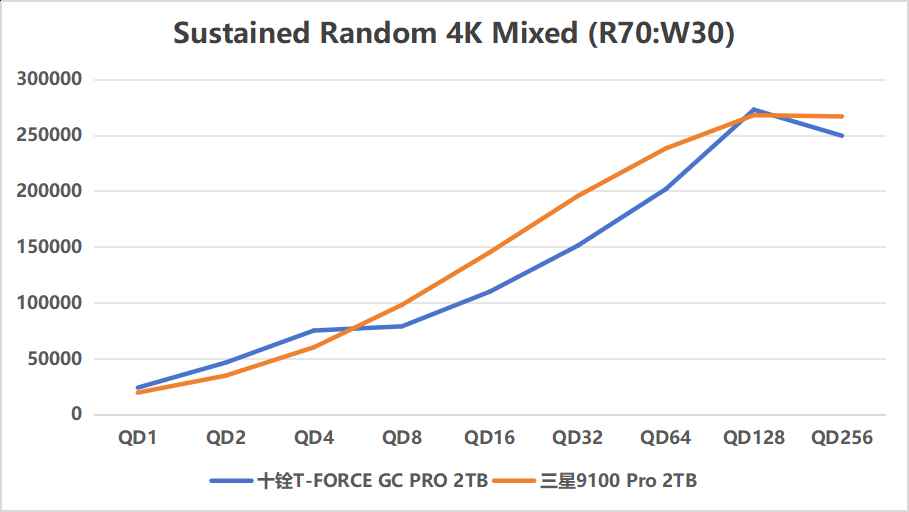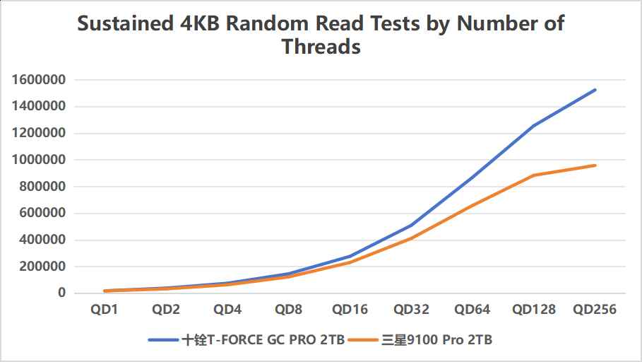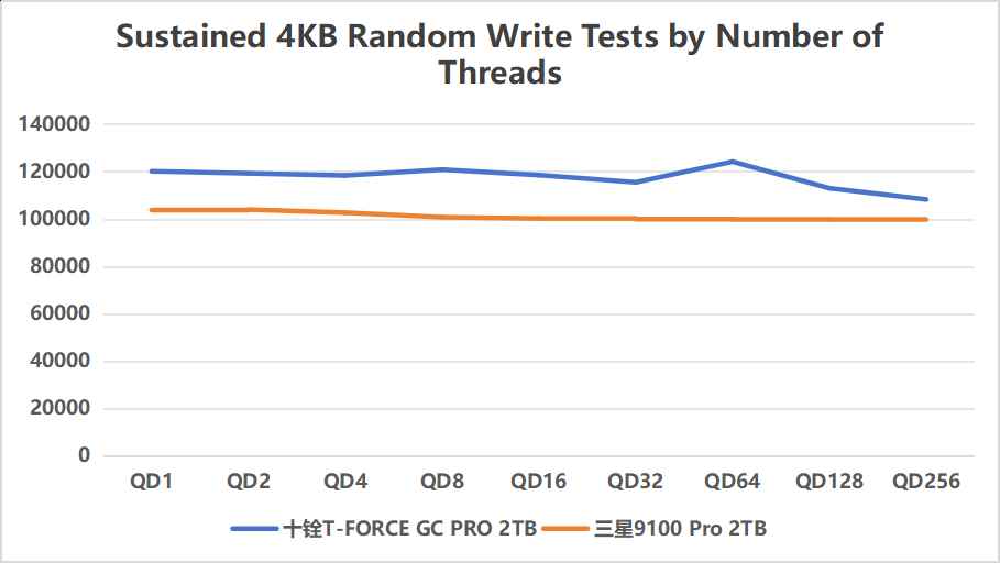 而在4K随机纯读、纯写项目中,十铨T-FORCE GC PRO就明显比三星9100 PRO更强了: