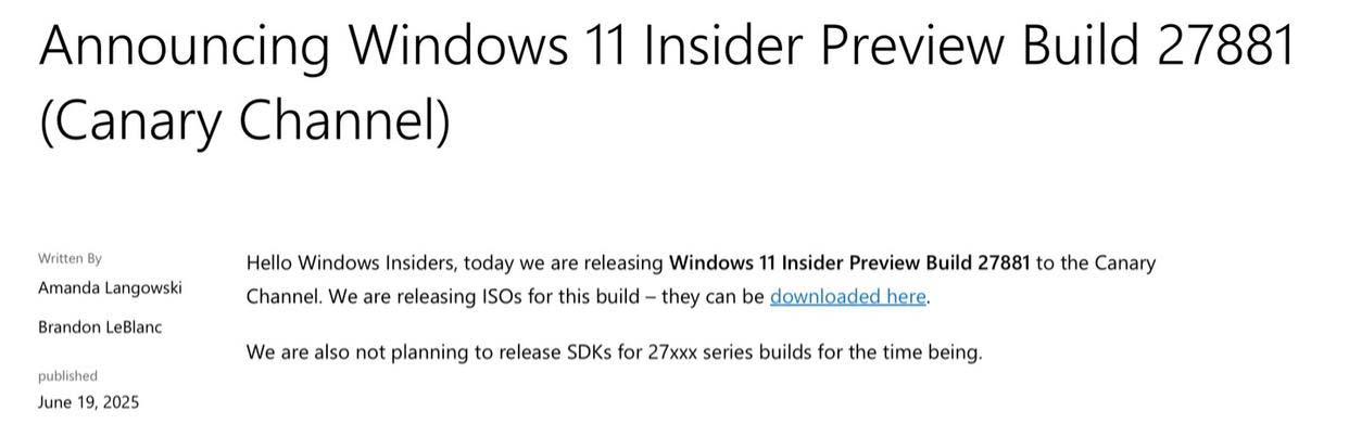 微软现已向 Canary 通道的预览体验成员推送了最新的 Windows 11 Insider Preview Build 27881 版本更新。