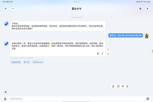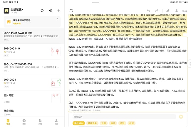 iQOO Pad2 Pro具备非常出色自然语言理解能力,而AI笔记创作可以帮你创作出非常优质的笔记,编写朋友圈文案、小红书种草文章只是基本操作,另外它可以帮你写工作周报、制作思维导图等。