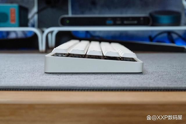 整体造型规矩方正,上下盖拼色的设计颇为独特。键盘外壳通体CNC铝合金,手感爽滑不易留下接触痕迹,180度喷砂工艺,应该是第一次被用到矮轴键盘上,真的非常的细腻。整体尺寸108mm*357mm*25.5mm,不到3cm的厚度下重量也仅有1030g。