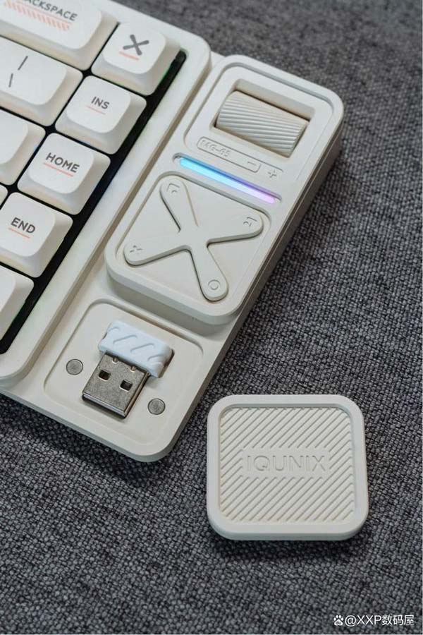 MG65 Pro最右侧的多功能区:音量调节滚轮、自定义区、2.4G接收器收纳仓。收纳仓采用了磁吸设计,平时如果使用有线或者蓝牙连接模式,可以把2.4G接收器放好,这样就不用担心会遗失了。