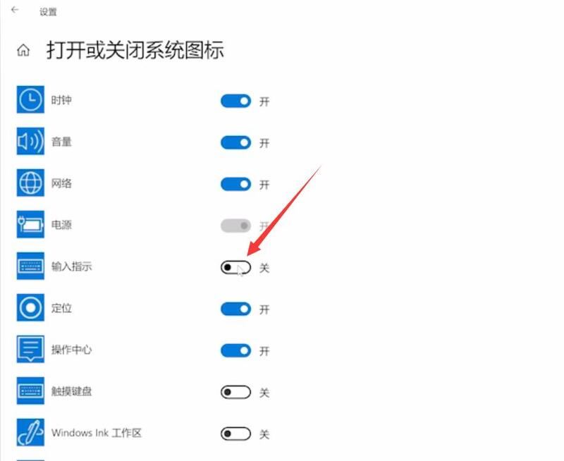 2.点击打开或关闭系统图标,开启输入指示,即可看到输入法。