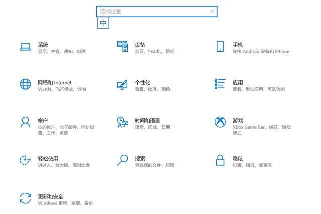 2.点击“齿轮状”图标后,即可进入电脑系统的“设置”界面: