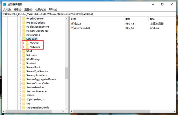 2、依次进入“HKEY_LOCAL_MACHINE\SYSTEM\CurrentControlSet\Control\SafeBoot”,看看能不能找到“Minimal”及 “Network”两个项。