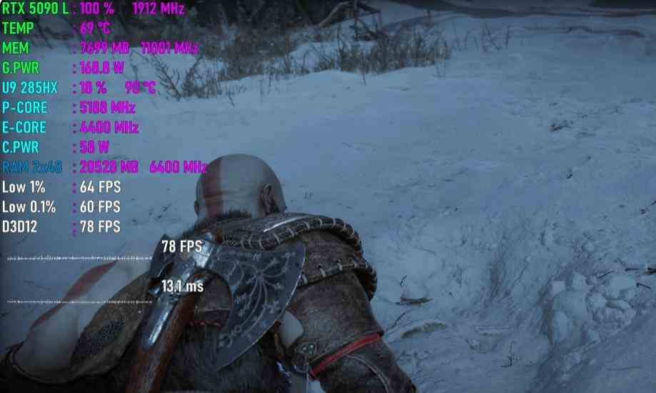 平均帧速为78 FPS,最低瞬时帧速为64 FPS,帧时间为13.1ms,CPU使用率为18%,功耗为58W,温度为90度,内存使用量为20.5GB,GPU使用率为100%,显存使用量为7.7GB,功耗为169W,温度为69度。