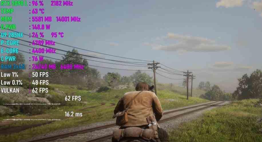 平均帧速为62 FPS,最低瞬时帧速为50 FPS,帧时间为16.2ms,CPU使用率为24%,功耗为76W,温度为95度,内存使用量为24.2GB,GPU使用率为96%,显存使用量为5.6GB,功耗为149W,温度为63度。