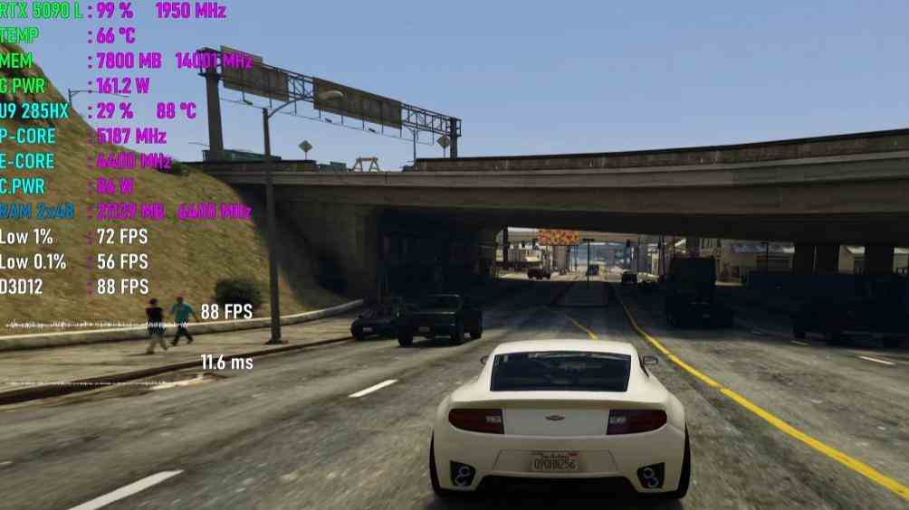 平均帧速为88 FPS,最低瞬时帧速为72 FPS,帧时间为11.6ms,CPU使用率为29%,功耗为86W,温度为88度,内存使用量为21.1GB,GPU使用率为99%,显存使用量为7.8GB,功耗为161W,温度为66度。