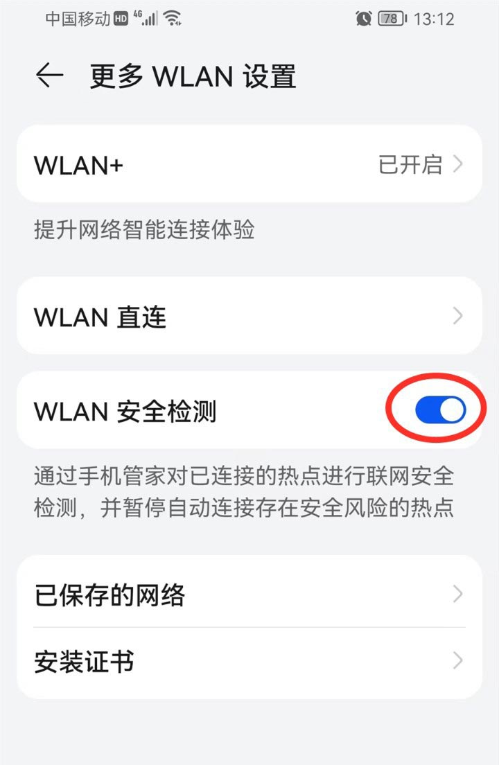 进入更多WLAN设置,打开/关闭“WLAN安全检测”开关,即可开启/关闭WLAN安全检测。