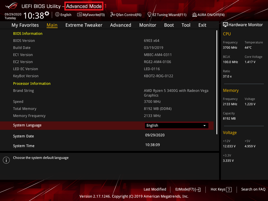 1. 电脑开机后,立刻按压键盘上的’delete’键,进入BIOS [Advanced Mode]页面