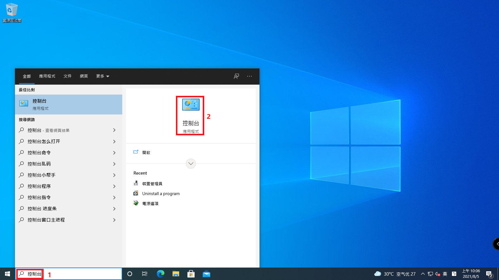 1. 在工作列上的搜索方块中,输入「控制台」,然后选取 [控制台]。