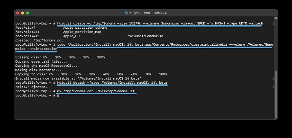 hdiutil create -o /tmp/Sonoma -size 15179m -volname Sonomaiso -layout SPUD -fs HFS+J -type UDTO -attach sudo /Applications/Install\ macOS\ 14\ beta.app/Contents/Resources/createinstallmedia --volume /Volumes/Sonomaiso --nointeraction hdiutil detach -force /Volumes/Install\ macOS\ 14\ beta mv /tmp/Sonoma.cdr ~/Desktop/Sonoma.ISO