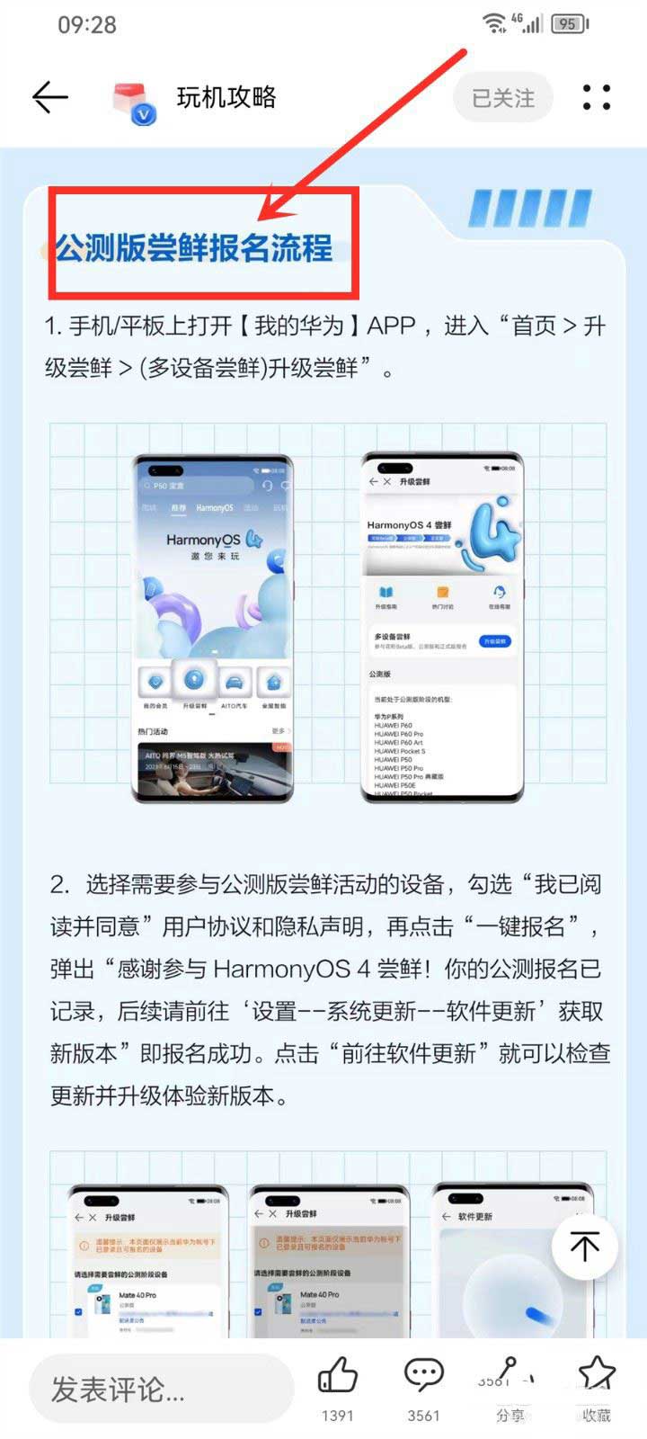 进入鸿蒙4.0升级指南,打开“HarmonyOS 4公测版尝鲜报名指导”。