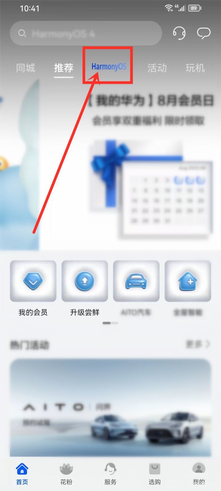 打开我的华为app首页,点击顶部“HarmonyOS”选项。