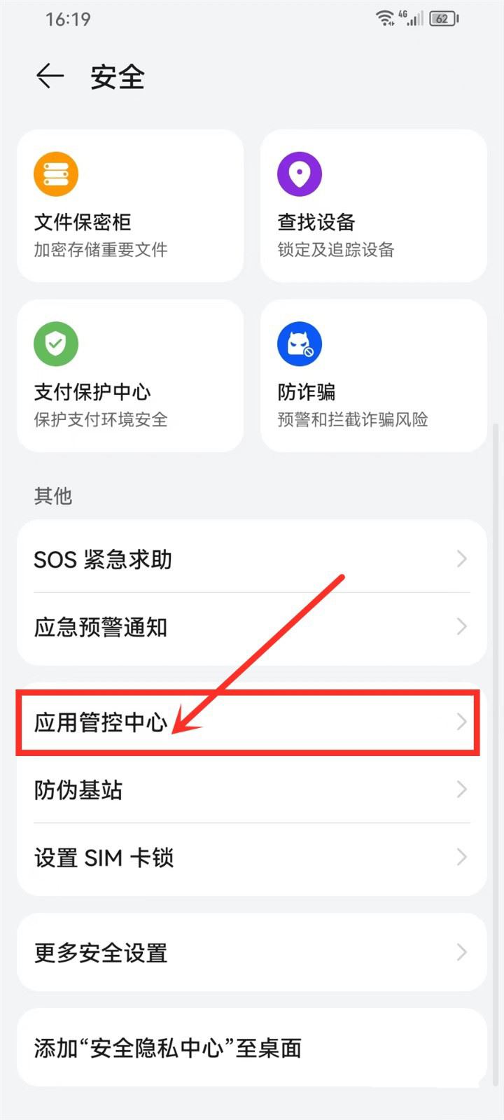 进入安全页,点击“应用管控中心”选项。