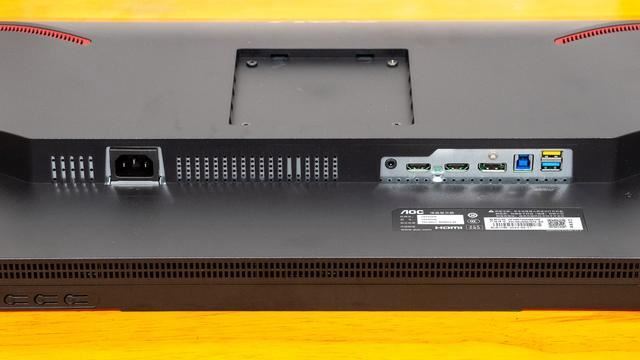接口一览,内置电源适配器再次好评。此外它还提供了一个3.5mm音频接口、双HDMI 2.1 满血接口、DP 1.4接口、USB-B上行接口,两个USB3.0 接口,其中黄色的还支持反向充电使用。当然如果在显示器侧面也加入一组USB 接口就更方便了。