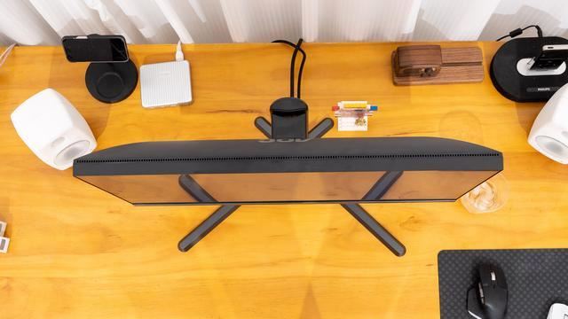 俯看显示器效果,因为内部有2304颗灯珠以及QD-MiniLED 面板所以俯看下会感觉略厚。当然这样做还有一个好处就是,AOC U27G3XM 显示器采用了内置适配器设计。相比需要拖块砖头适配器的显示器来讲,我更喜欢这样内置电源适配器的显示器产品。