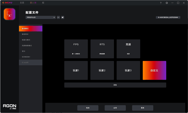 AOC U27G3XM 显示器作为AOC 新的GAMING 系列显示器,所以还可以通过G-Menu软件直接快速设置显示器模式。整体配置也是充满了电竞风格元素。
