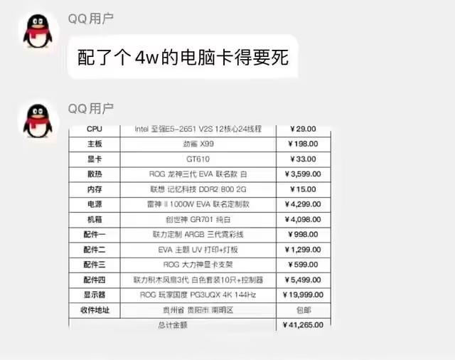 网友的这台4w预算配置清单如何?显然是不合适的。电脑的核心配置还是性能端的CPU、主板、显卡、内存、固态、电源,以及显示端的显示器,风扇、机箱和其它配件,够用就行。