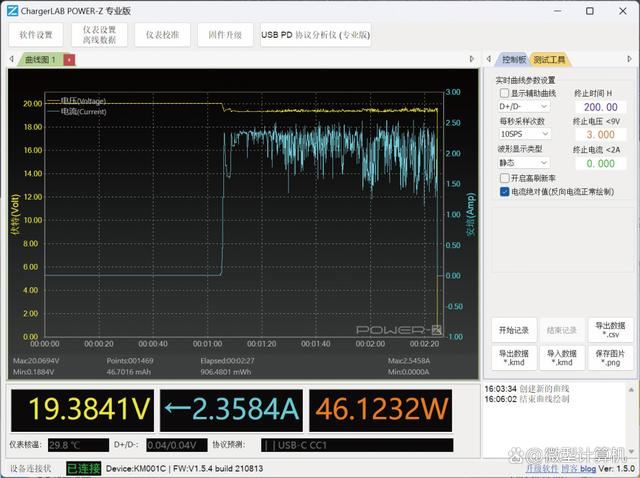 另外,AORUS FO32U2P所搭配的USB Type-C接口可支持最高65W功率的供电能力,能为搭载USB Type-C接口的笔记本电脑进行反向充电。配合笔记本电脑使用时,使用附带的USB Type-C线缆既能当数据传输线也能当作电源线使用,一根线就能搞定数据传输和供电,更加方便。我将AORUS FO32U2P搭配一款游戏本使用,通过一根USB Type-C线缆就完成图像音频的传输和充电,不用再外接笔记本电脑的电源线。随后,通过专业测试设备“Power-Z”对供电进行测试,可以看到数据显示它的充电功率能达到46.12W(19.38V/2.35A)左右。部分笔记本满载过程中可能需要的功耗过高,超过极限承载功耗的话,可能仍需外接笔记本电源。