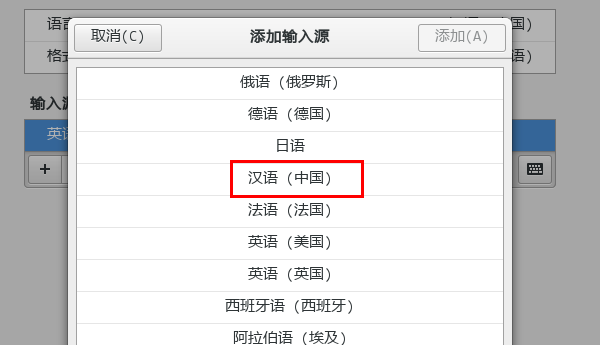 4、在输入源中,点击“汉语(中国)”。