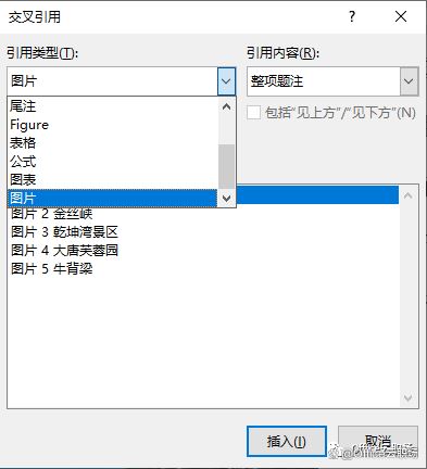 首先将鼠标至于“见”字后面,然后单击【引用】/【插入】-【交叉引用】,点击【引用类型】,选择【图片】,对话框效果如下: