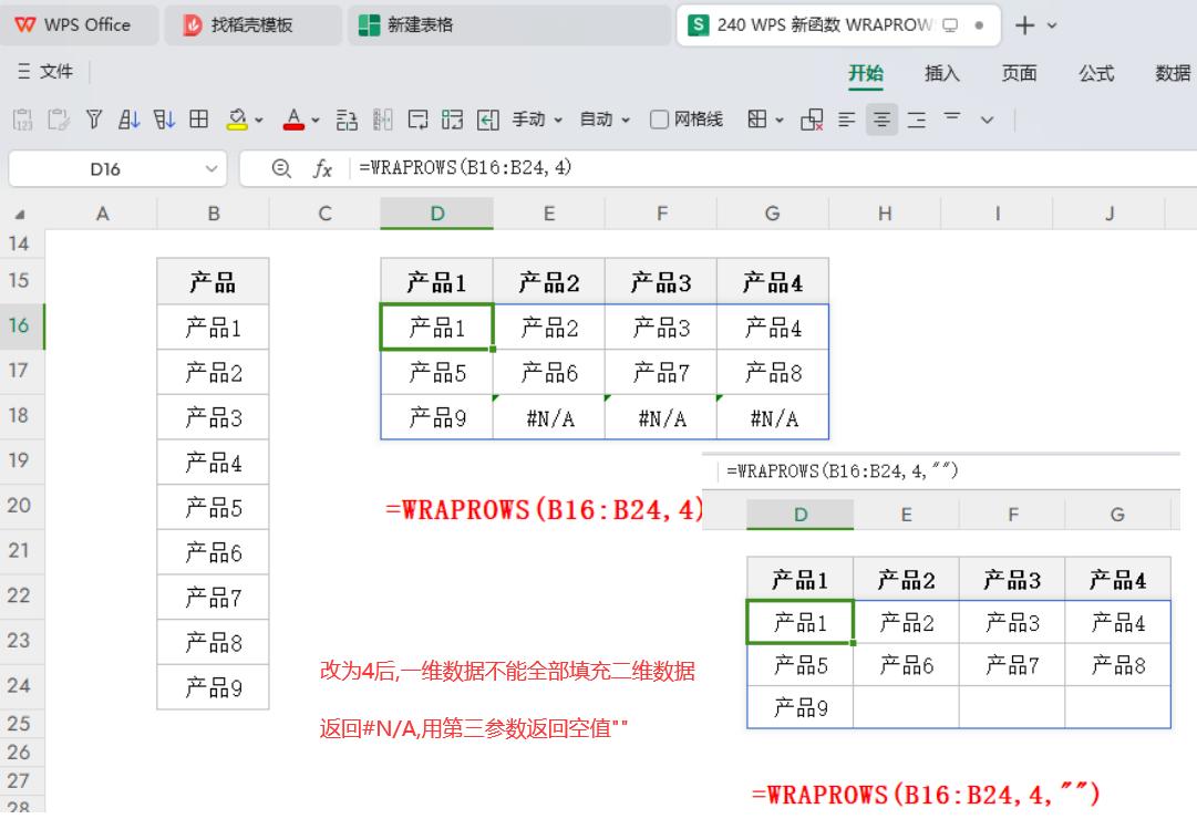 返回4列: =WRAPROWS(B16:B24,4,"")