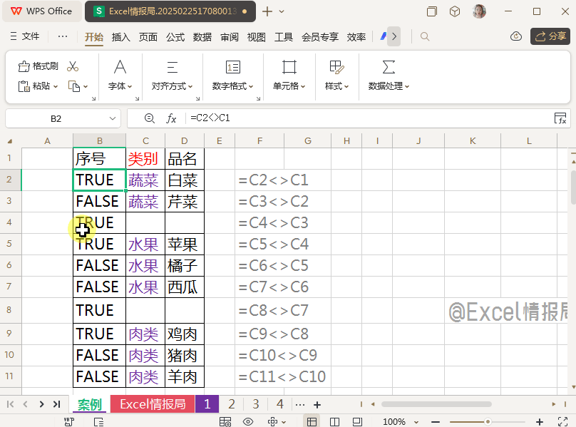 我们人为使C2单元格与上一单元格C1内容做一个不等于的逻辑式。这样我们下拉填充公式后,其实判断的就是C列的当前单元格内容与上一单元格内容是否不相同。很明显会返回逻辑值TRUE或FALSE。