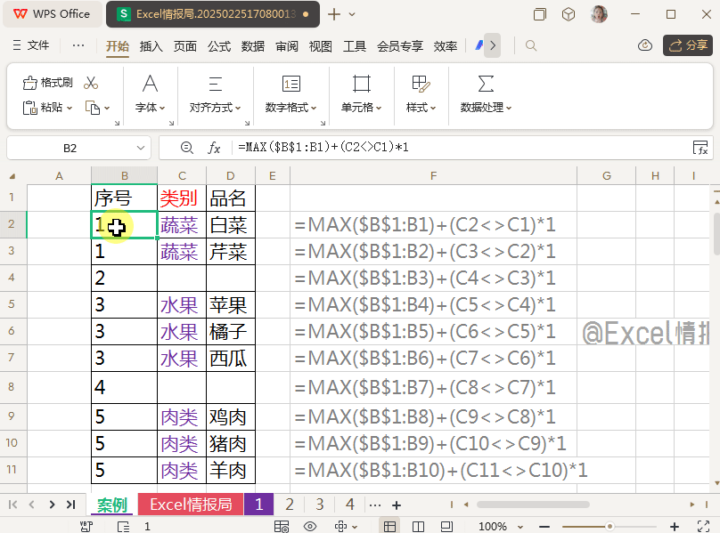 - B8→MAX($B$1:B7)+(C8<>C7)*1→3+1=4