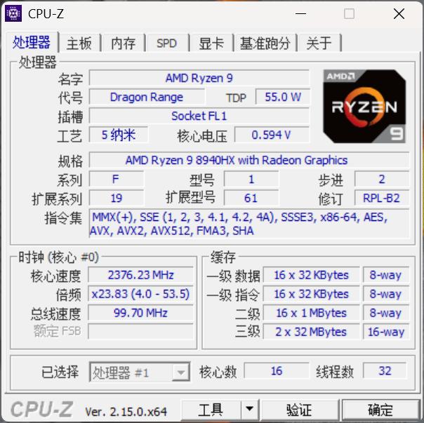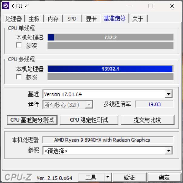 蛟龙16Z Pro采用了锐龙9 8940HX处理器,拥有16颗物理大核心和64MB三级缓存,最高频率为5.3GHz。在CPUZ的性能测试项目上,这在CPUZ的BENCHMARK中单线程732.2分,多线程13923.1分,多线程倍率也达到了19.03倍。