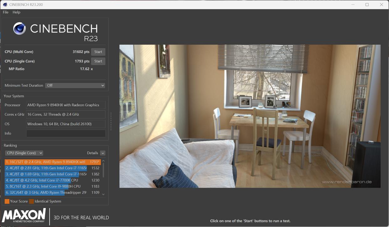 通过负载更高的CINEBENCH R23可以看到高负载时蛟龙16Z Pro单线程得分为1793pts,多线程31602pts,多线程倍率17.62x,可见,机械革命对这颗处理器的调校很出色。