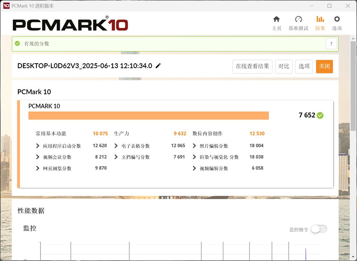 用于整机性能测试PCMark10中,蛟龙16Z Pro总成绩达到了7652分,其中常用基本功能10075分,生产力9632分,数位内容创作12530分。