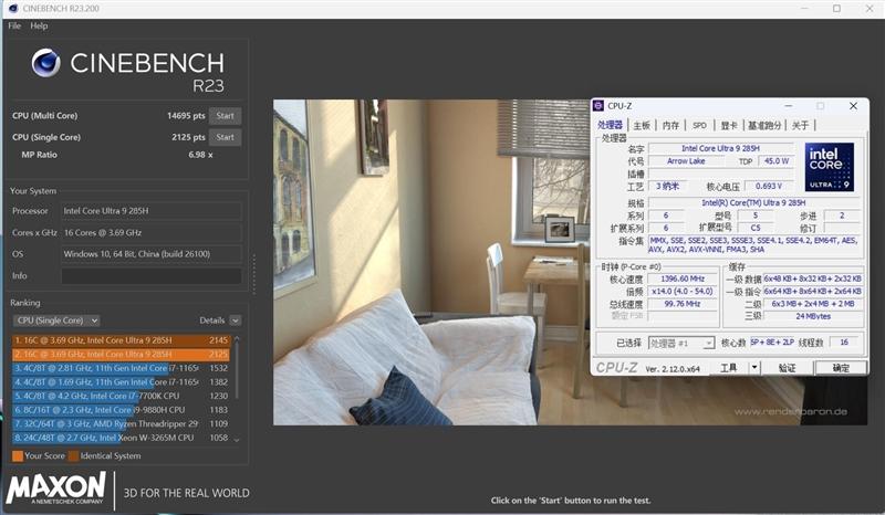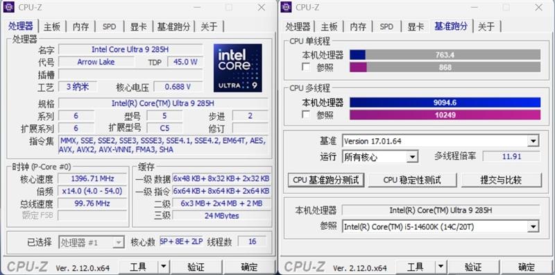 至于多核性能,由于酷睿Ultra 9 285H没有超线程,比起AMD锐龙AI 9 HX 370差了6%左右,但是比起32W的酷睿Ultra 7 155H则强了23%