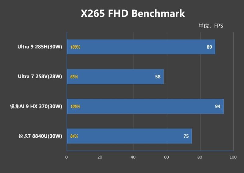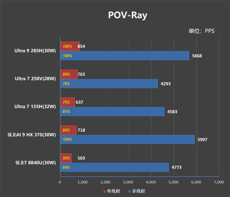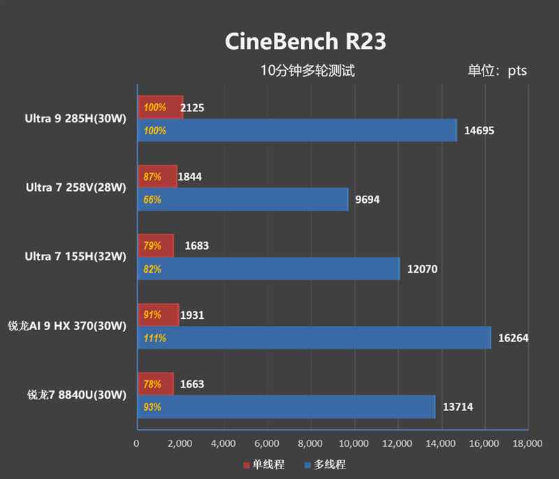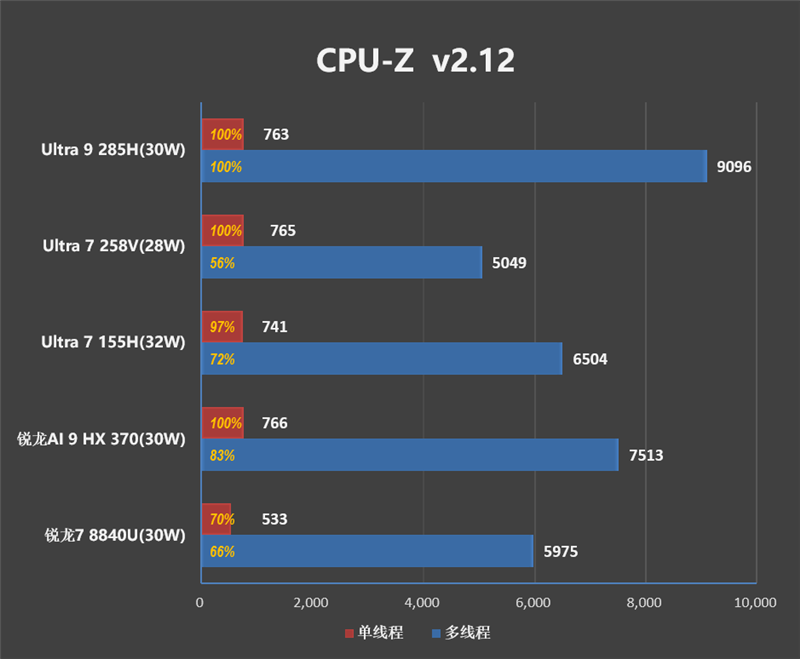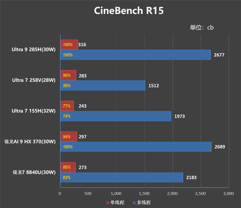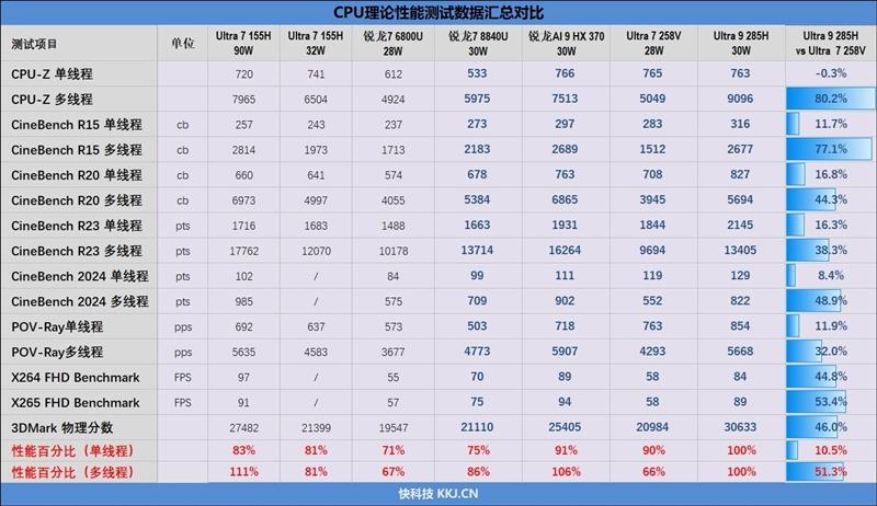 30W的酷睿Ultra 9 285H拥有最强的单核性能,比酷睿Ultra 7 155H强了20%左右,比AMD锐龙AI 9 HX 370强了10%左右。