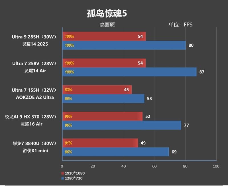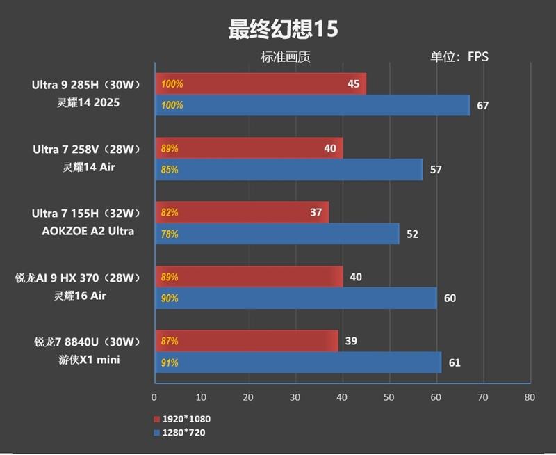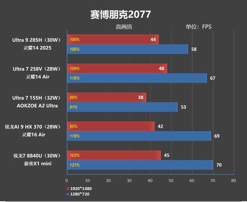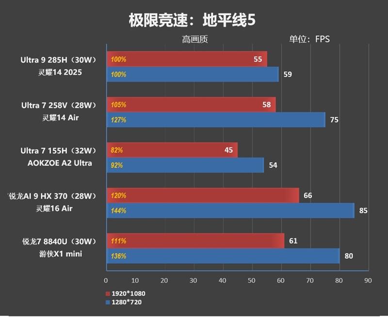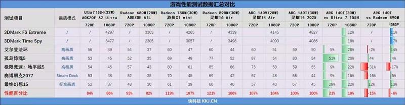 综合看来,1080P分辨率下Arc 140T的游戏性能比AMD最强的Radeon 890M弱了8%左右,但是比上代的Ultra 7 155H要强了10%。
