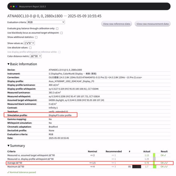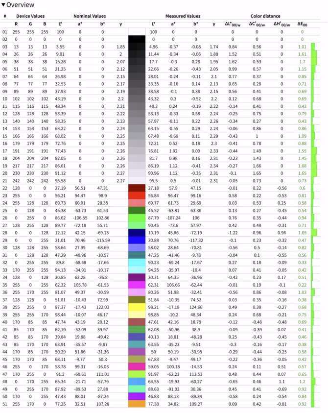 可以看到在Display P3色域设置下,ProArt创16 2025的色准△E为0.78,并且每个色块的显示效果都非常出色。