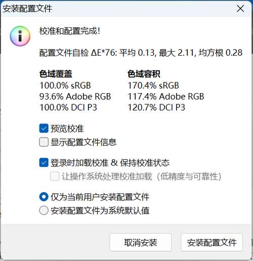 原生色域模式下,可以看到色域容积基本完全覆盖,其中sRGB的容积达到170.4%,并且sRGB和DCI-P3的色域覆盖均达到100%。
