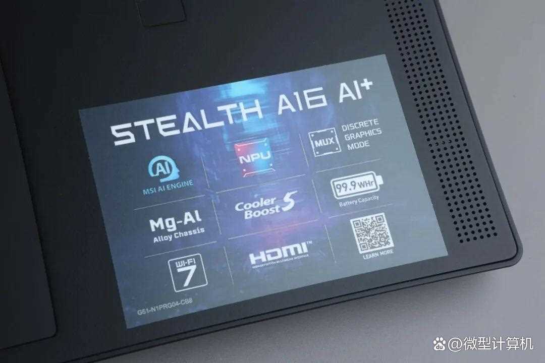 从C面右下角贴的标识还能看到,这台机器采用Wi-Fi 7无线网卡,支持最新的Wi-Fi 7。作为下一代Wi-Fi标准,Wi-Fi 7在Wi-Fi 6的基础上引入了320MHz带宽、4096-QAM、Multi-RU、多链路操作、增强MU-MIMO以及多AP协作等技术,使得Wi-Fi 7相较于Wi-Fi 6可提供更高的数据传输速率和更低的时延。通过增加对Wi-Fi 7的支持,微星绝影16 AI+锐龙版更有“战未来”的味道。