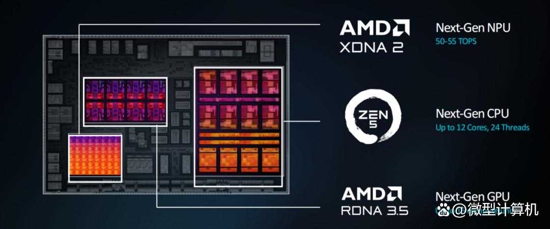 具体来讲,该系列处理器的CPU升级为“Zen 5”系列架构,叠加先进的4nm生产工艺,带来了强悍的性能和超高的能效比;GPU升级为RDNA 3.5架构,图形性能显著提升;NPU则升级为全新的XDNA 2架构,针对生成式AI的支持更为全面和丰富,全新的NPU算力大幅提升到50 TOPS,远超行业同类产品。在CPU+GPU+NPU三大算力引擎的协同下,可为移动平台带来非凡的AI能力。