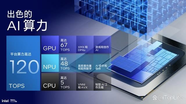 另外在AI方面,英特尔启用了全新的NPU 4,在INT 8上的性能可以达到48 TOPS,以实现微软的Copilot+ AI PC标准,从而满足未来的AI PC性能。但Lunar Lake也并非只有NPU提供AI计算性能,核显Arc Xe2-LPG也带来了更强的AI算力,总计达到120 TOPS。