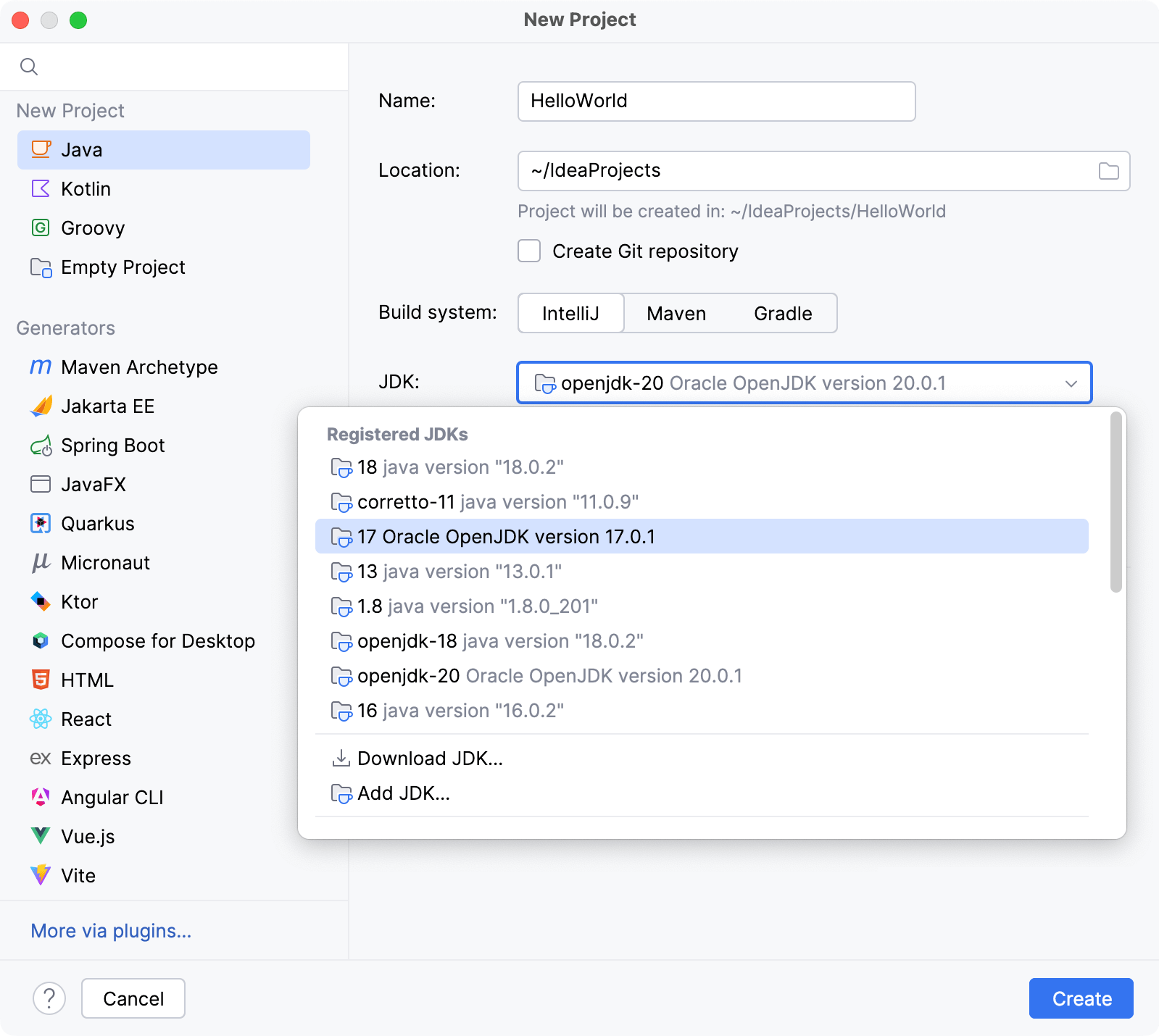 如果您的计算机上安装了 JDK,但未在 IDE 中定义,请选择"添加 JDK"并指定 JDK 主目录的路径(例如,/Library/Java/JavaVirtualMachines/jdk-20.0.1.jdk)。
